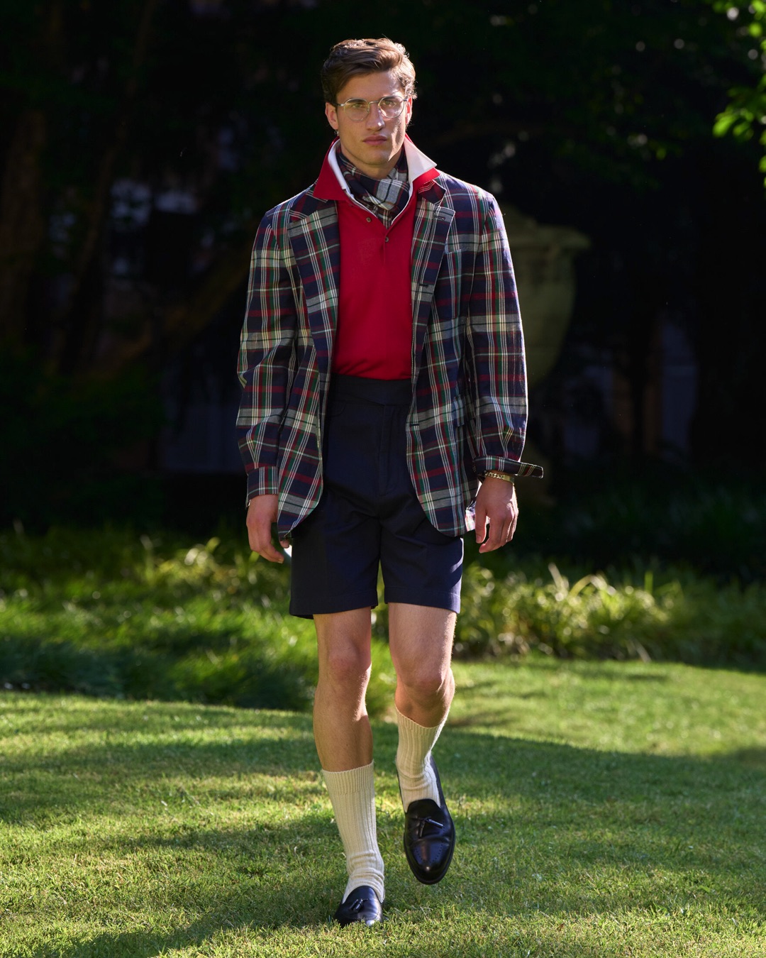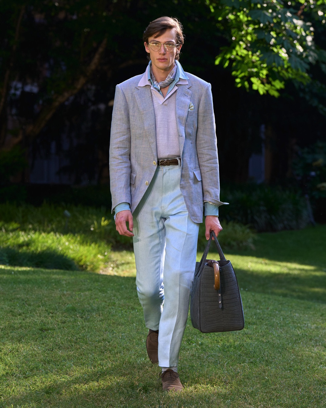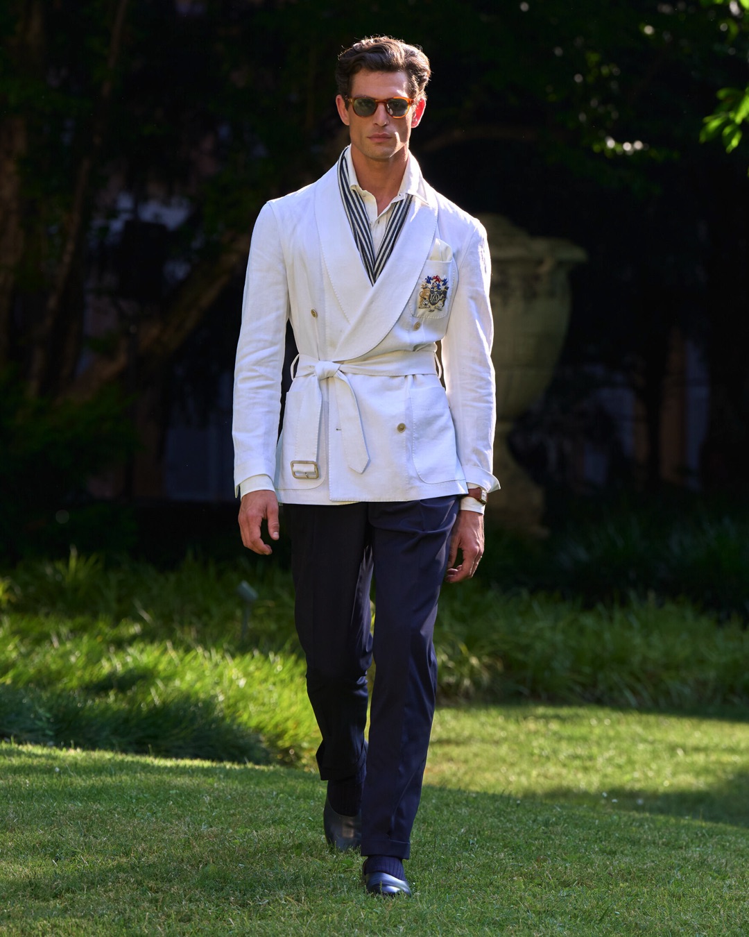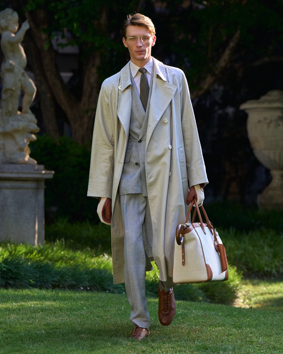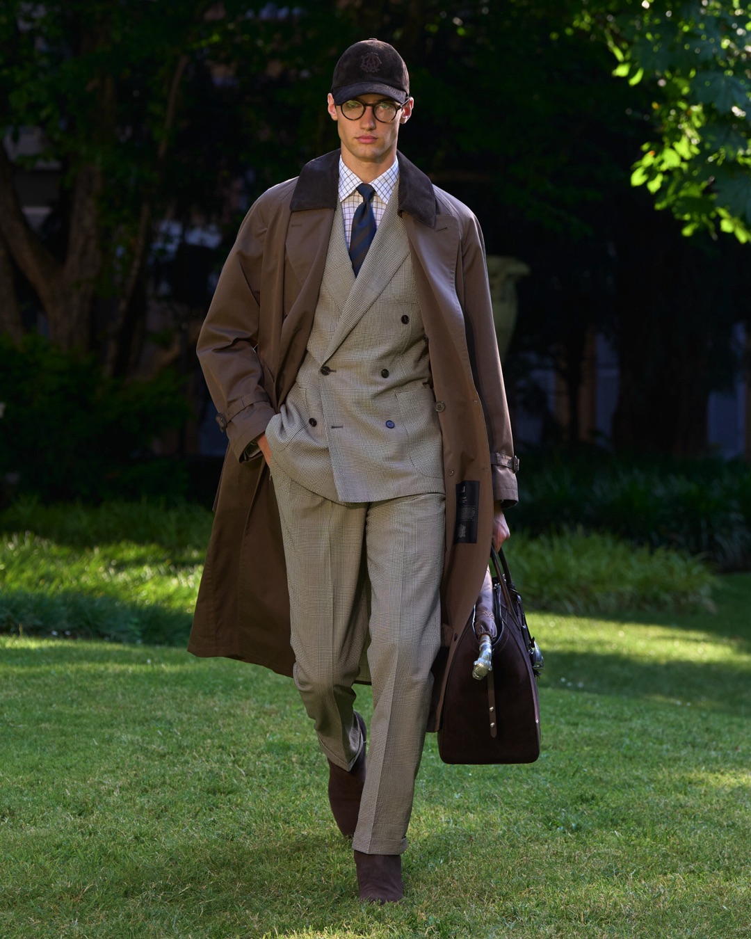 Key pieces include Glen check car coats lined in tattersall, bonded linen suits softened by sun-faded pastels, and haberdashery in irreverent gelato shades. English-milled fabrics – wool-linen blends, silk-cotton twills – are cut with precision and finished with hand-rolled seams and monogrammed cuffs. The Davies driving sneaker returns in supple suede, nodding to a rich motoring legacy.