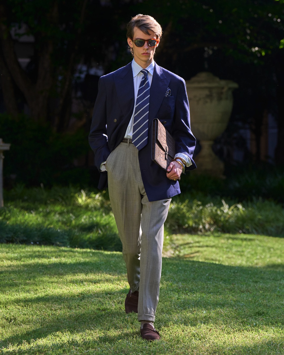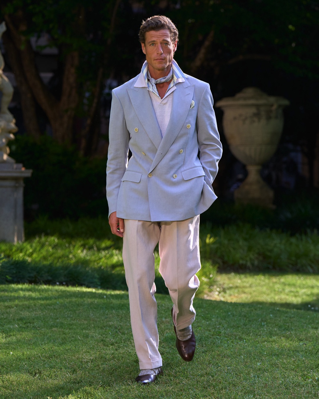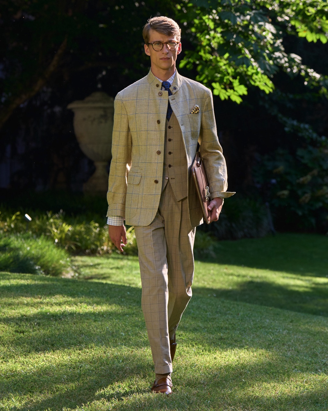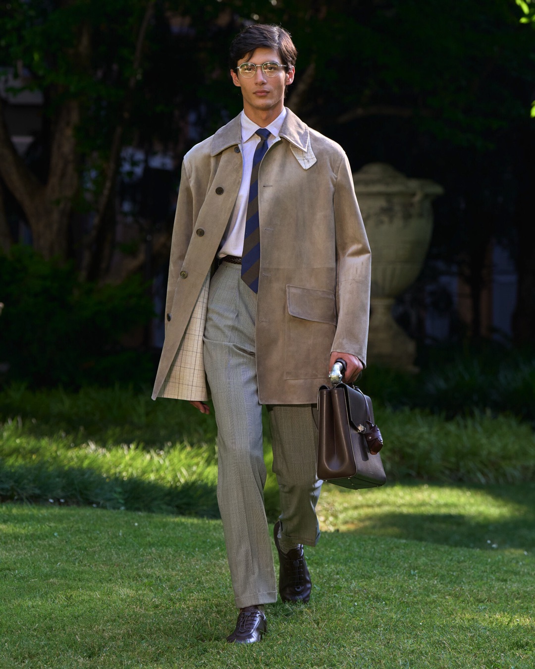Key pieces include Glen check car coats lined in tattersall, bonded linen suits softened by sun-faded pastels, and haberdashery in irreverent gelato shades. English-milled fabrics – wool-linen blends, silk-cotton twills – are cut with precision and finished with hand-rolled seams and monogrammed cuffs. The Davies driving sneaker returns in supple suede, nodding to a rich motoring legacy.