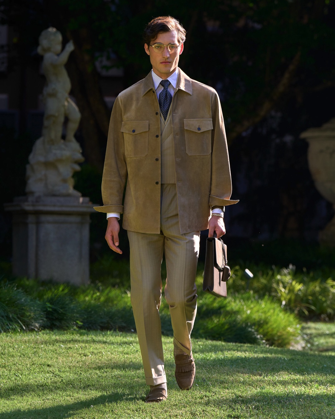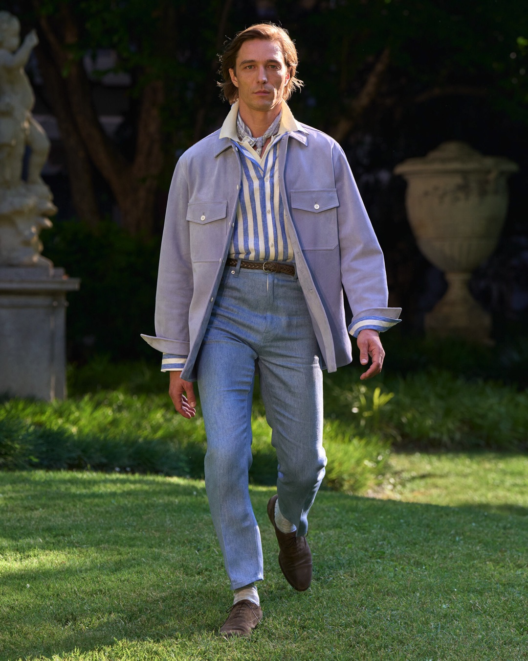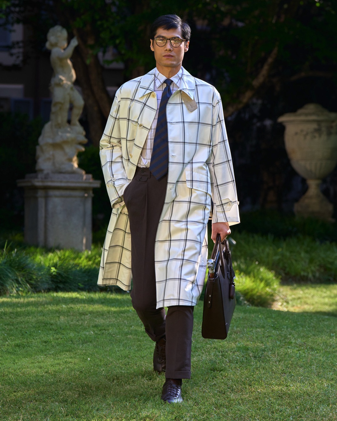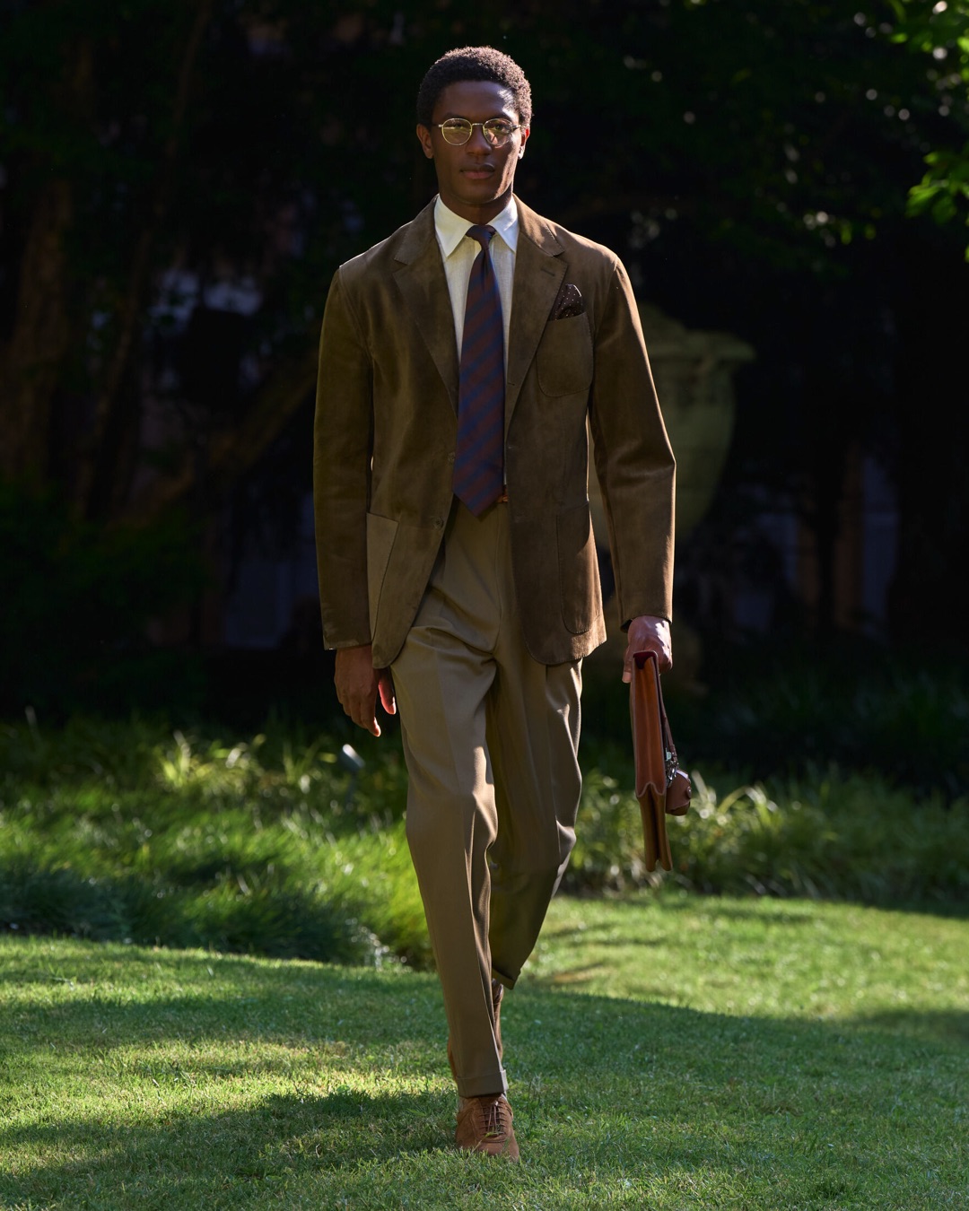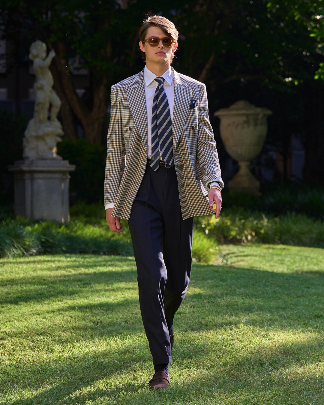 Key pieces include Glen check car coats lined in tattersall, bonded linen suits softened by sun-faded pastels, and haberdashery in irreverent gelato shades. English-milled fabrics – wool-linen blends, silk-cotton twills – are cut with precision and finished with hand-rolled seams and monogrammed cuffs. The Davies driving sneaker returns in supple suede, nodding to a rich motoring legacy.