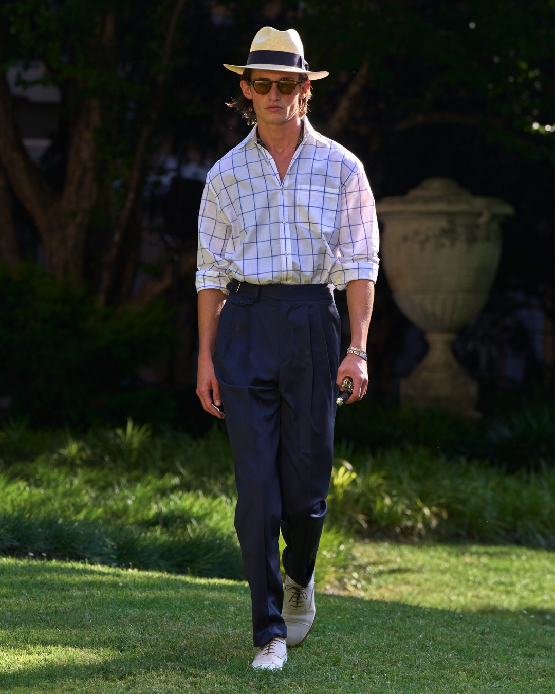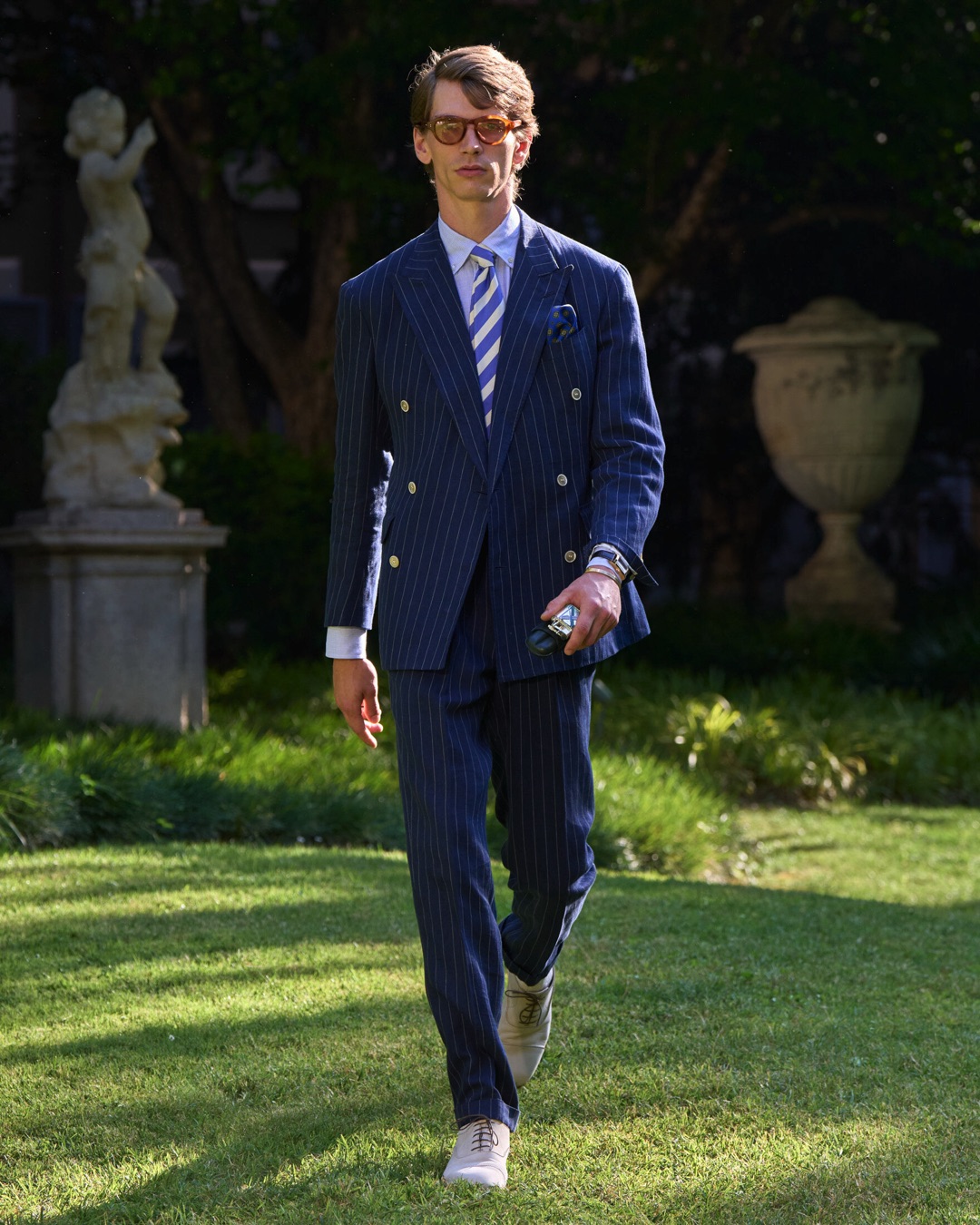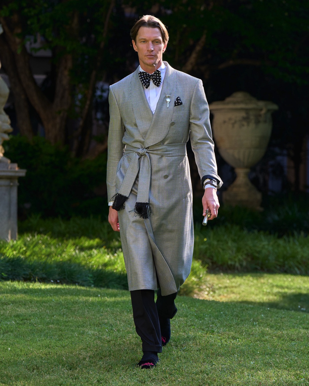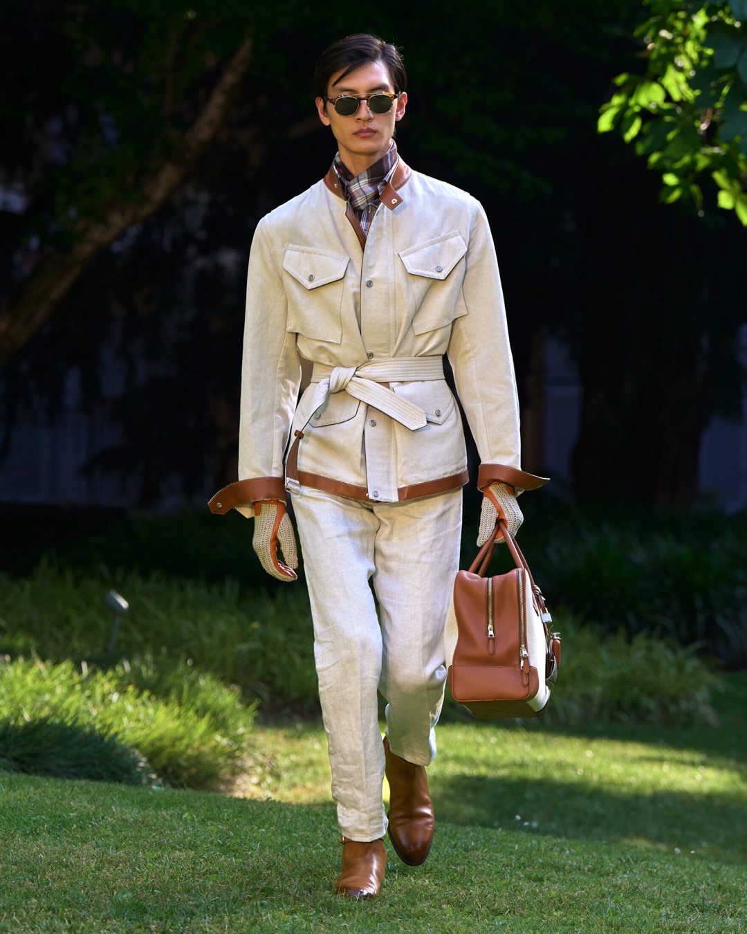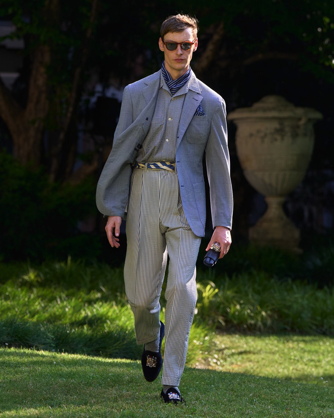Key pieces include Glen check car coats lined in tattersall, bonded linen suits softened by sun-faded pastels, and haberdashery in irreverent gelato shades. English-milled fabrics – wool-linen blends, silk-cotton twills – are cut with precision and finished with hand-rolled seams and monogrammed cuffs. The Davies driving sneaker returns in supple suede, nodding to a rich motoring legacy.