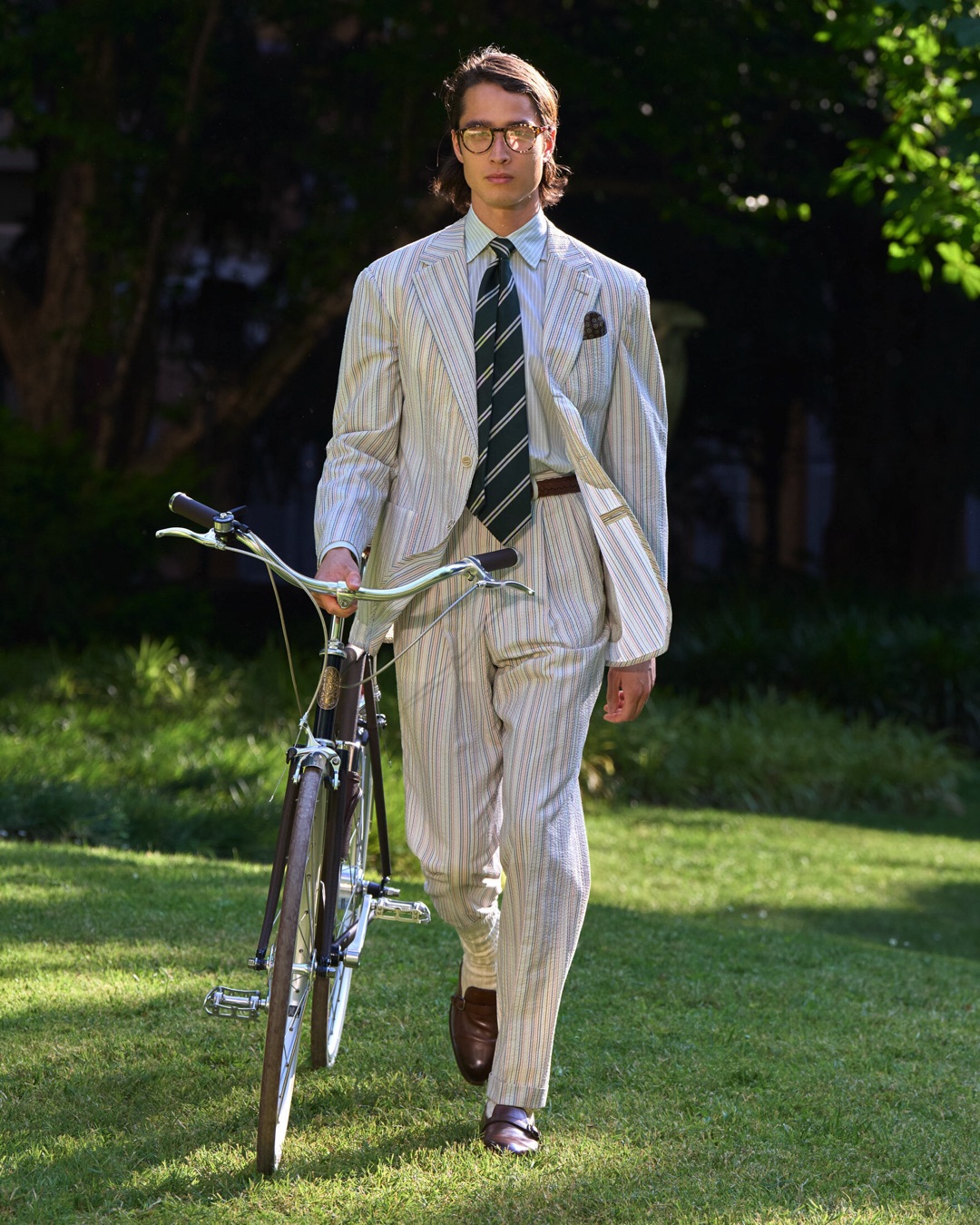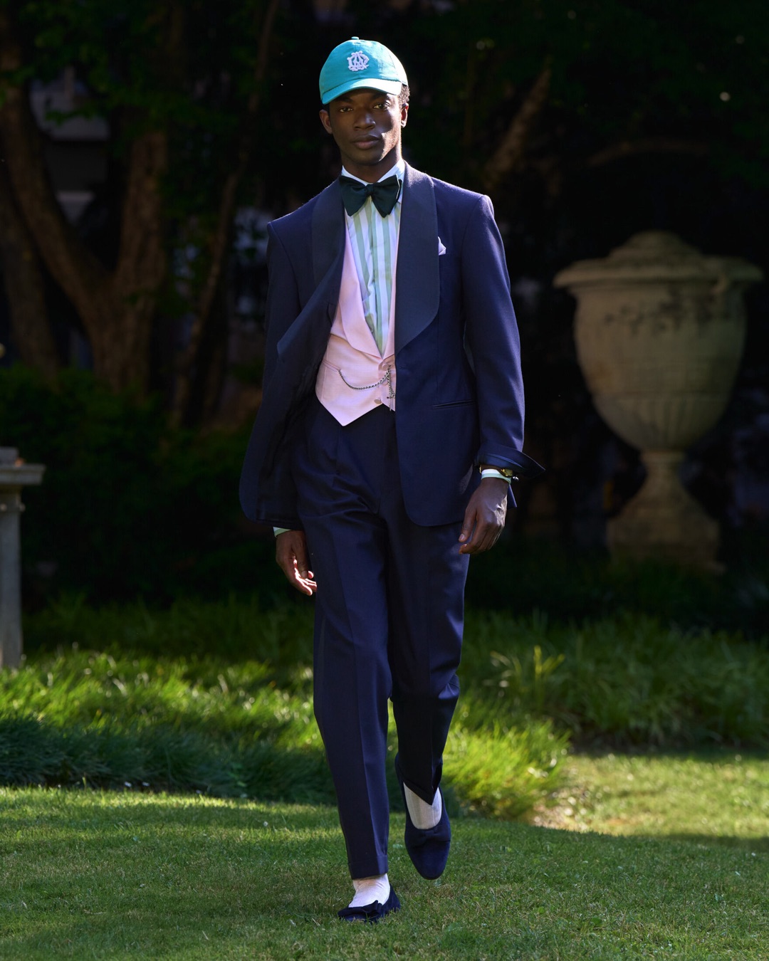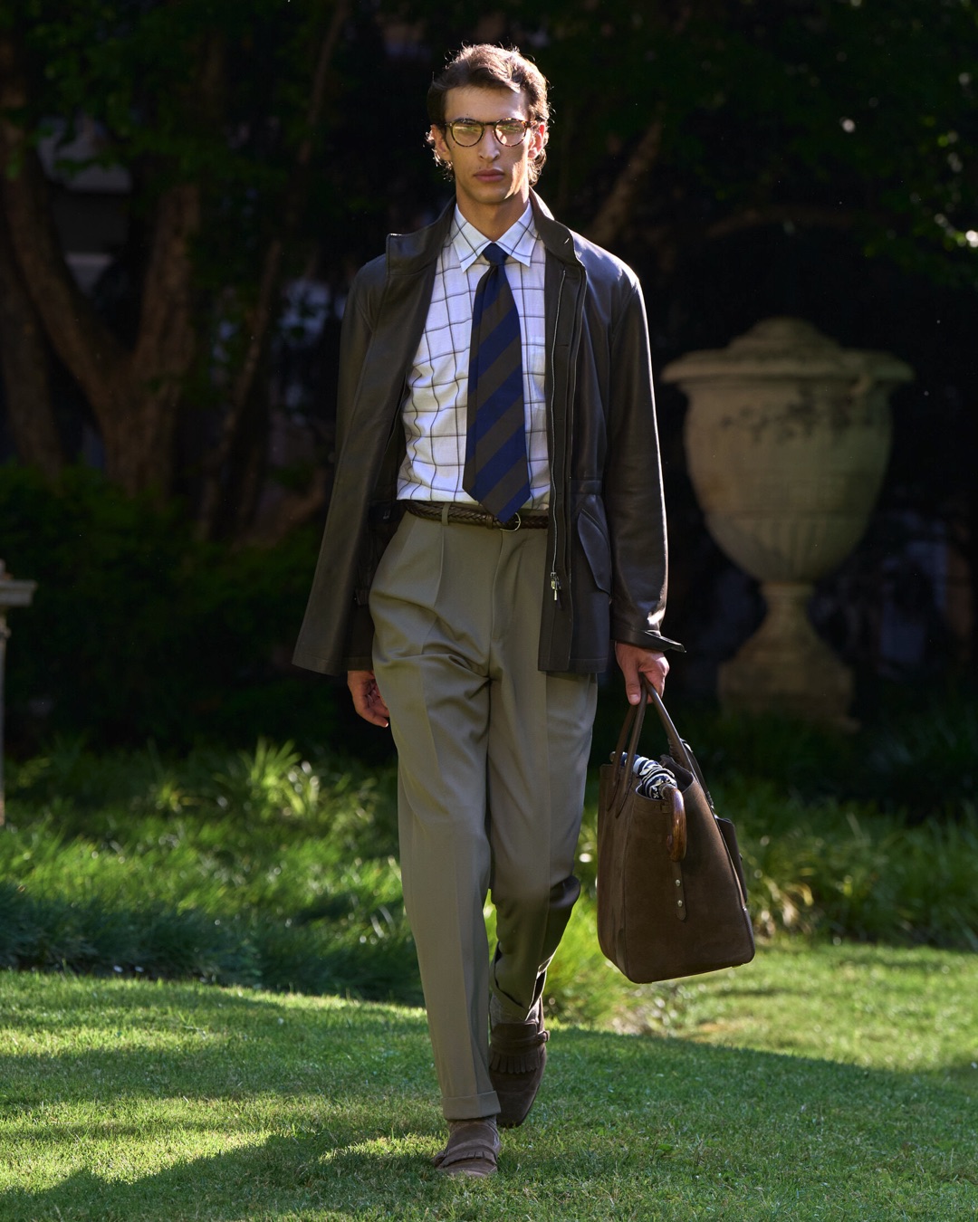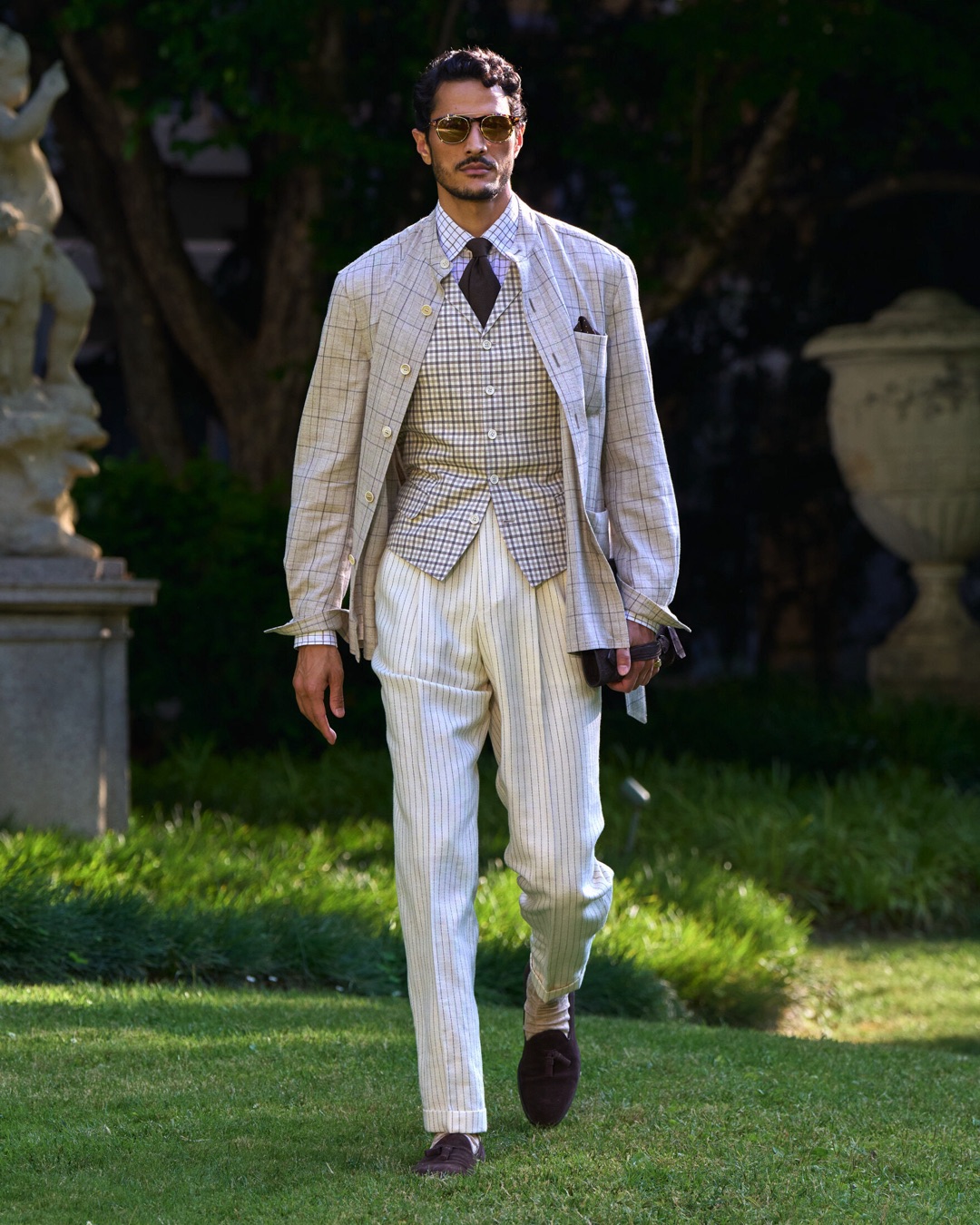 Key pieces include Glen check car coats lined in tattersall, bonded linen suits softened by sun-faded pastels, and haberdashery in irreverent gelato shades. English-milled fabrics – wool-linen blends, silk-cotton twills – are cut with precision and finished with hand-rolled seams and monogrammed cuffs. The Davies driving sneaker returns in supple suede, nodding to a rich motoring legacy.