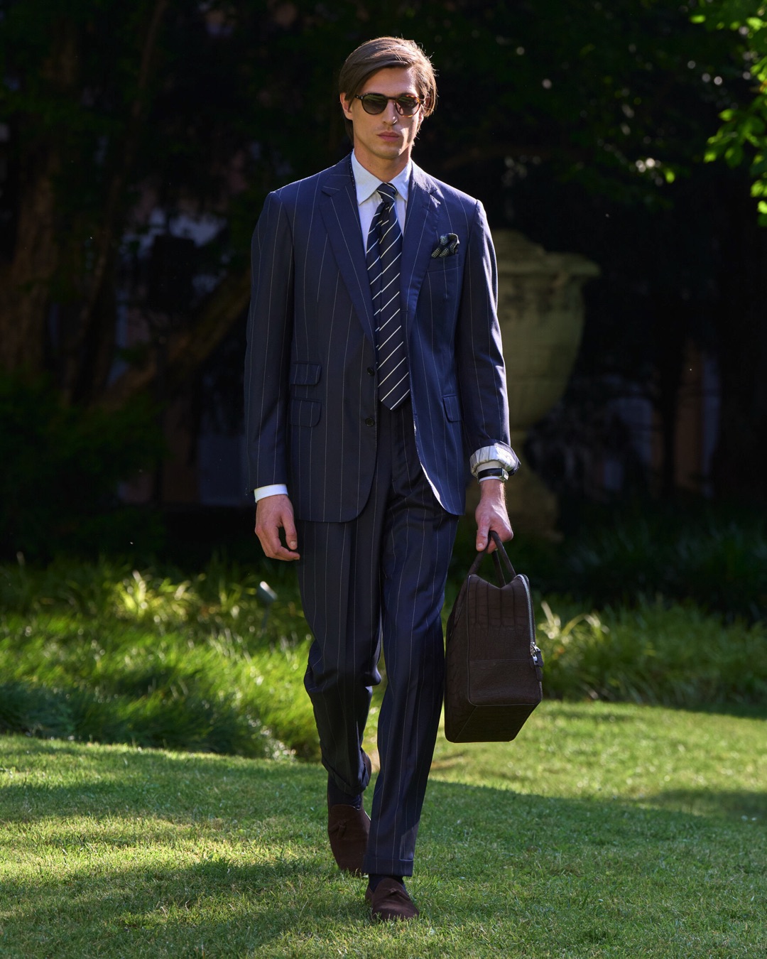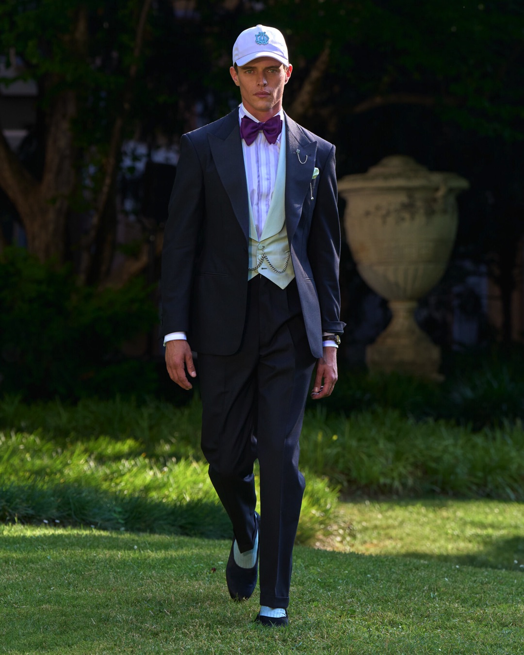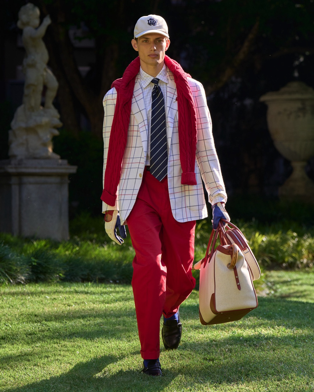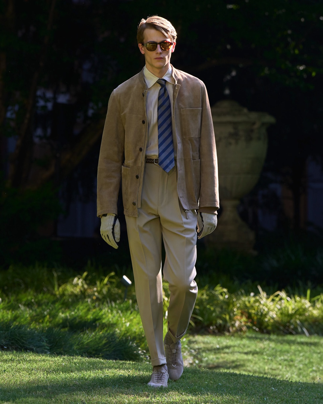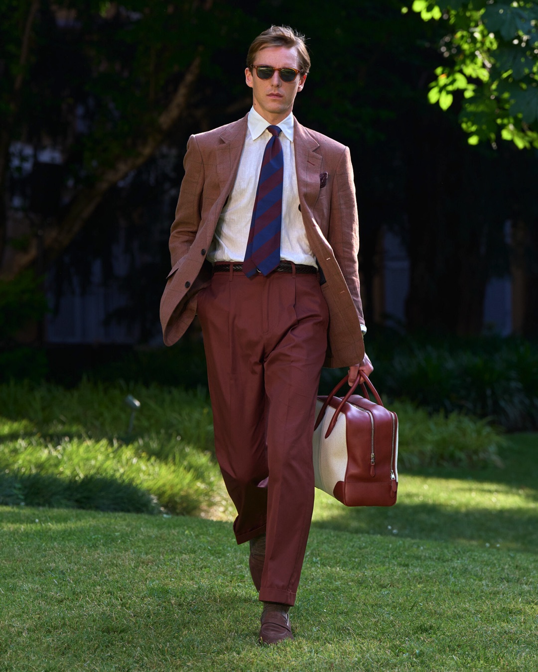 Key pieces include Glen check car coats lined in tattersall, bonded linen suits softened by sun-faded pastels, and haberdashery in irreverent gelato shades. English-milled fabrics – wool-linen blends, silk-cotton twills – are cut with precision and finished with hand-rolled seams and monogrammed cuffs. The Davies driving sneaker returns in supple suede, nodding to a rich motoring legacy.