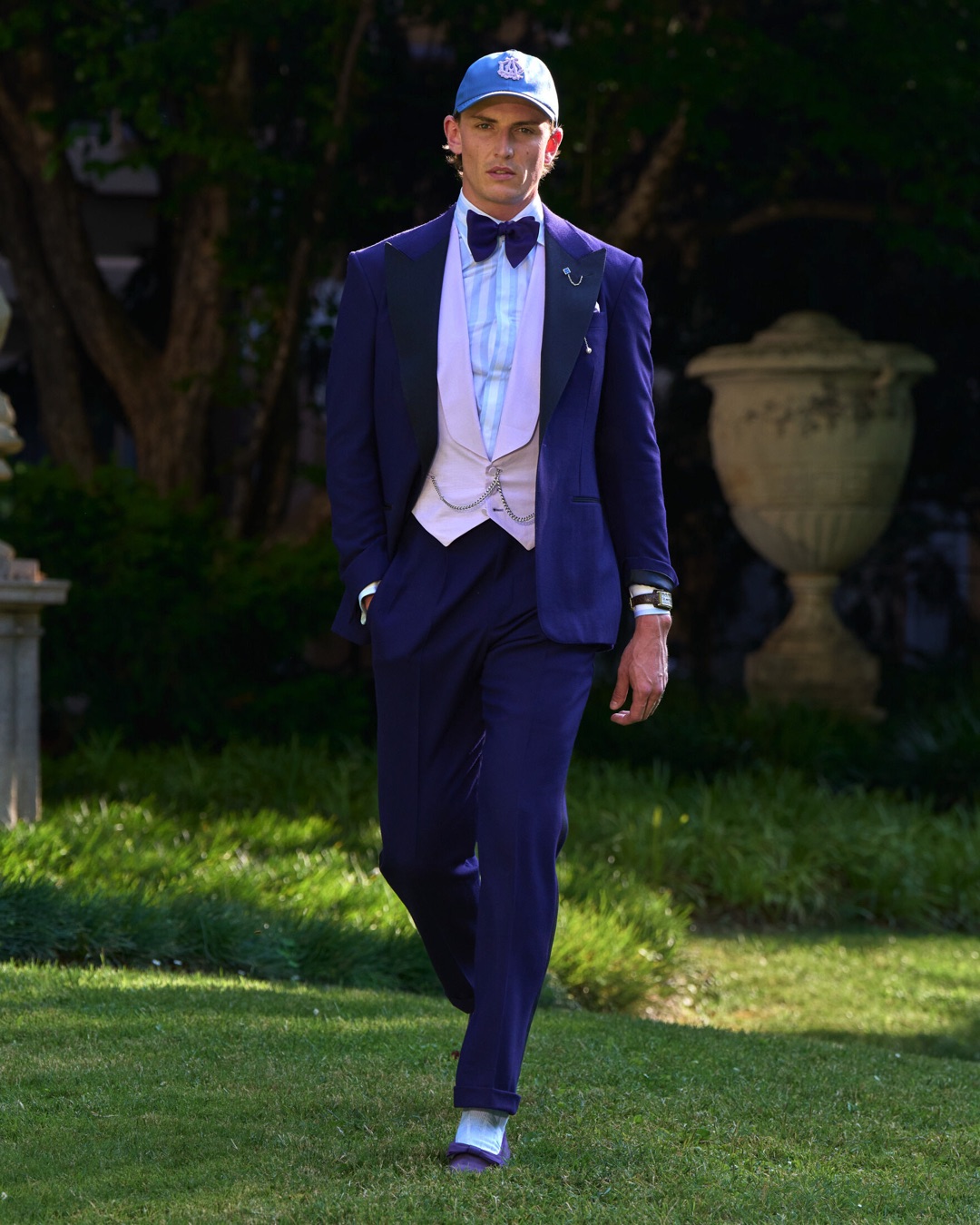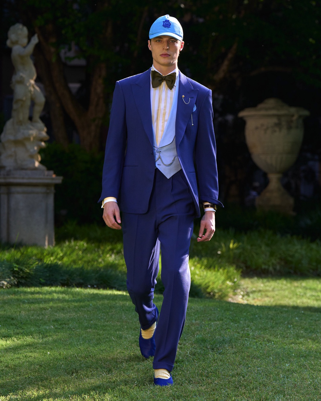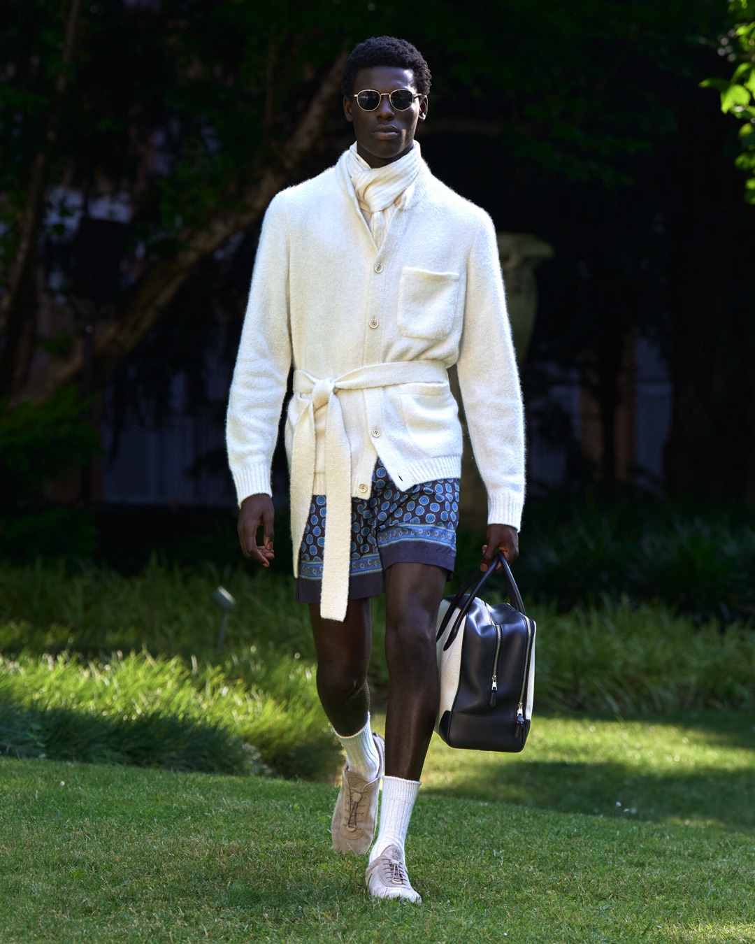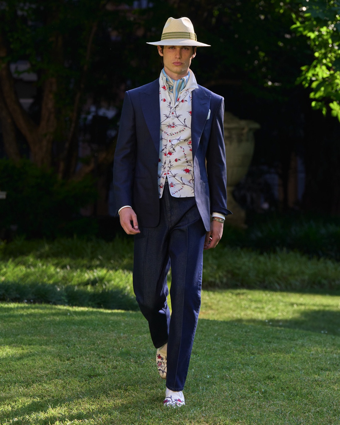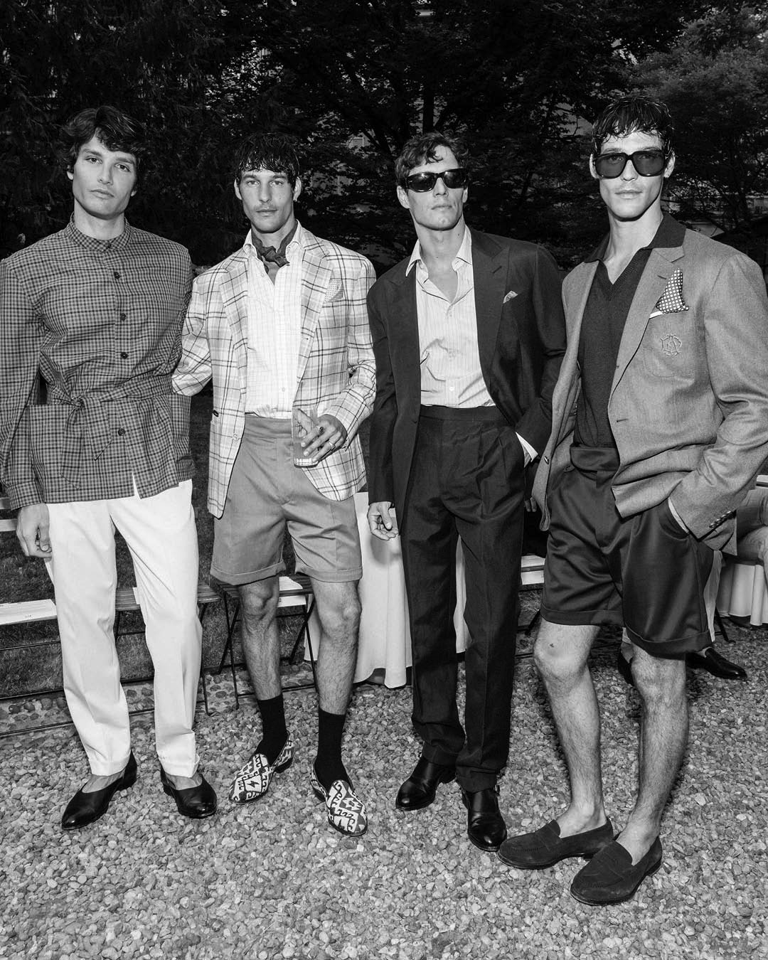 Key pieces include Glen check car coats lined in tattersall, bonded linen suits softened by sun-faded pastels, and haberdashery in irreverent gelato shades. English-milled fabrics – wool-linen blends, silk-cotton twills – are cut with precision and finished with hand-rolled seams and monogrammed cuffs. The Davies driving sneaker returns in supple suede, nodding to a rich motoring legacy.