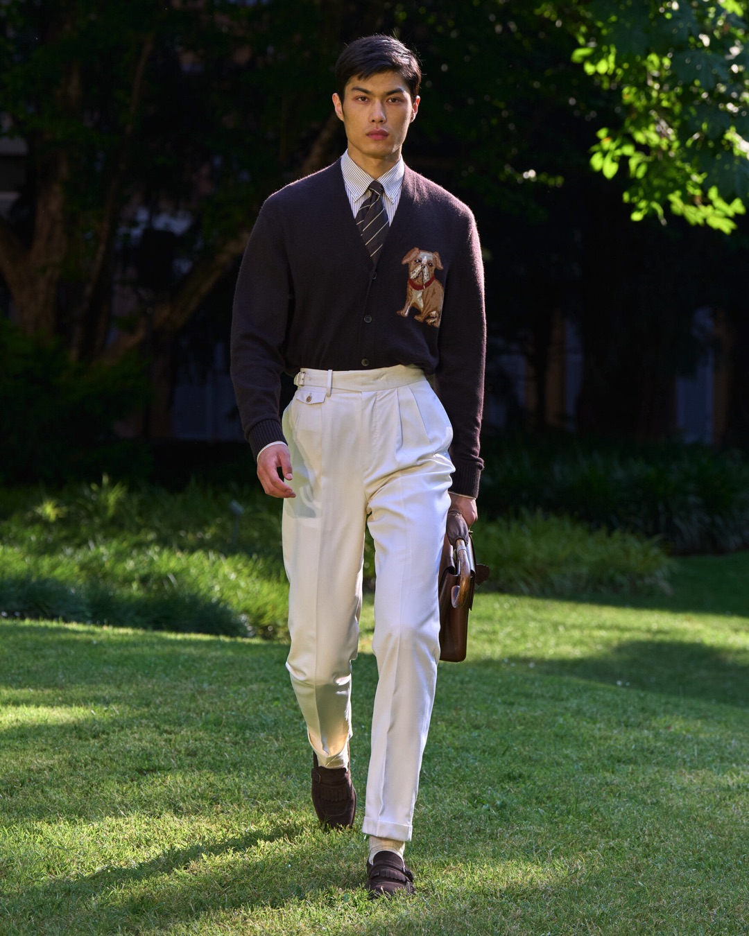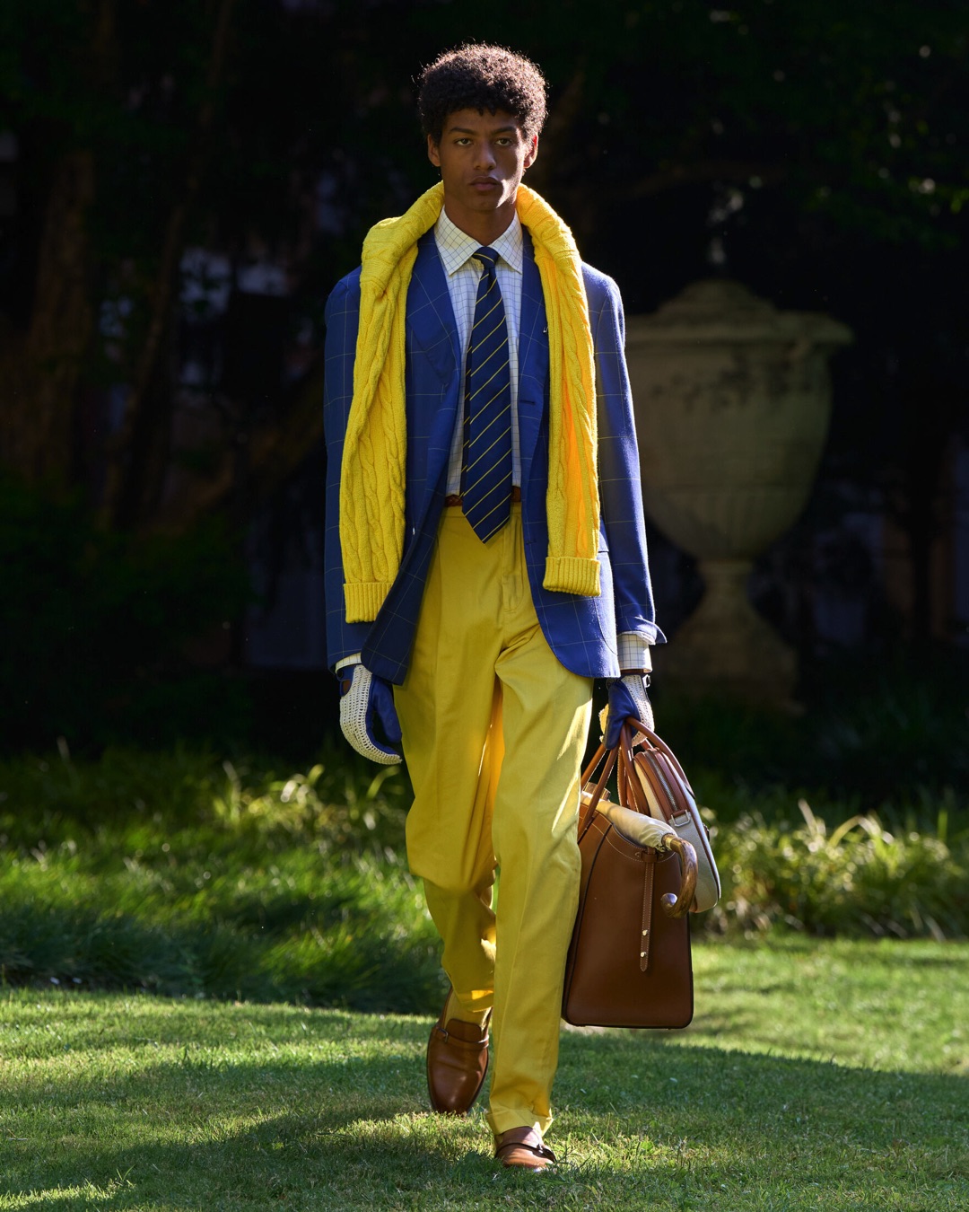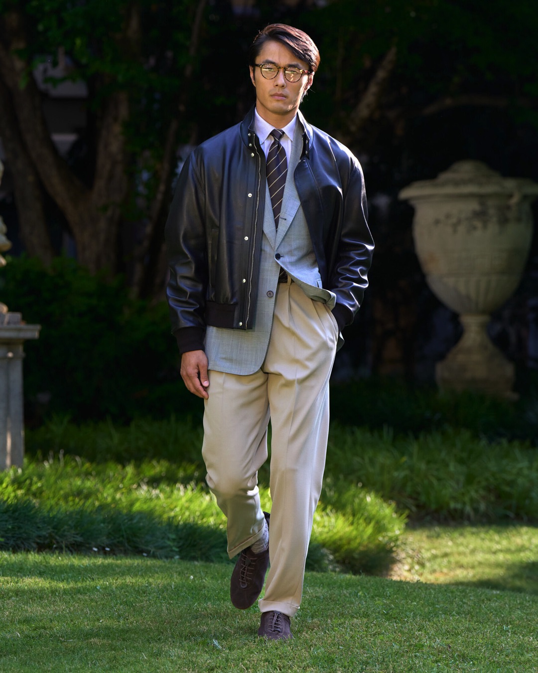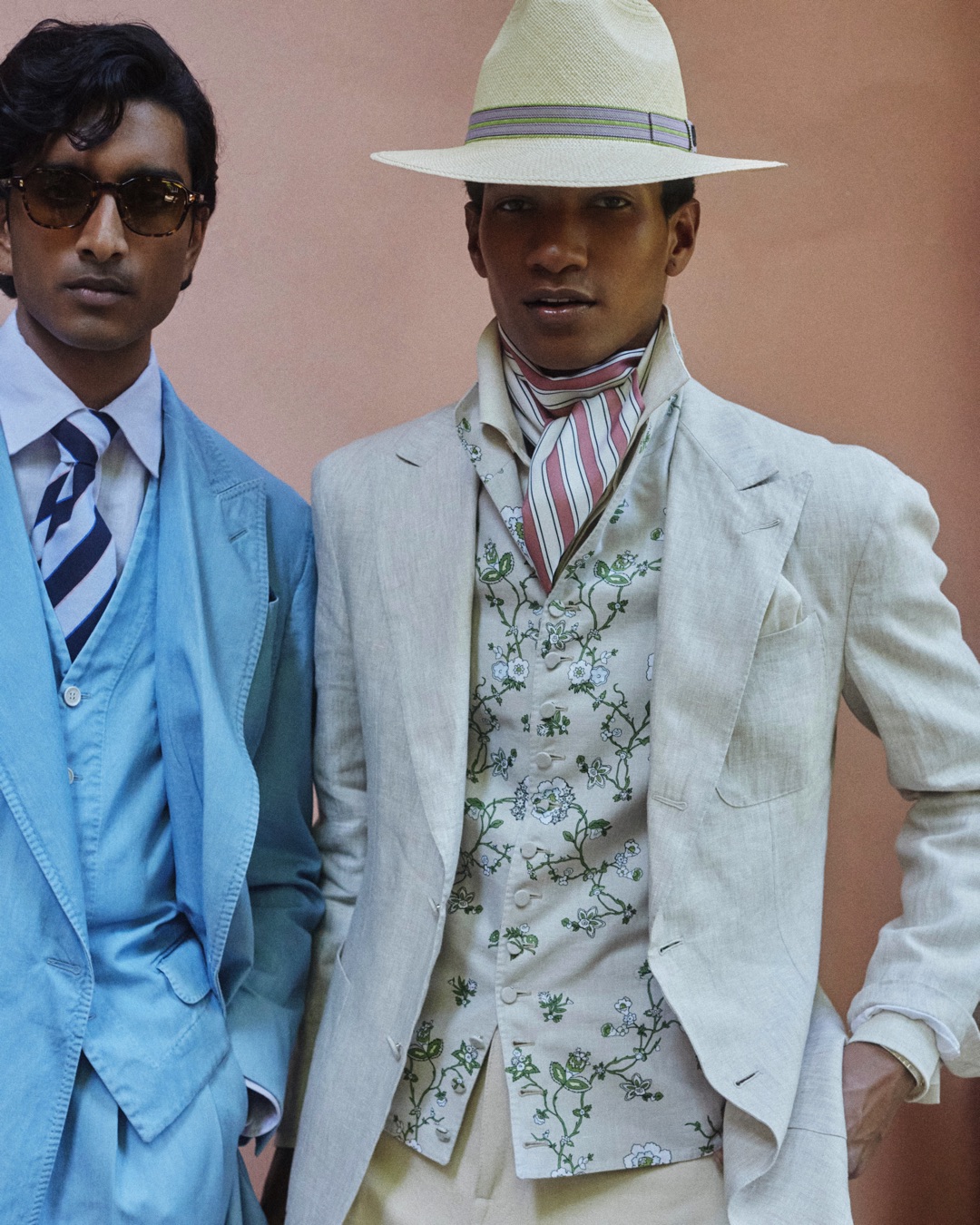 Key pieces include Glen check car coats lined in tattersall, bonded linen suits softened by sun-faded pastels, and haberdashery in irreverent gelato shades. English-milled fabrics – wool-linen blends, silk-cotton twills – are cut with precision and finished with hand-rolled seams and monogrammed cuffs. The Davies driving sneaker returns in supple suede, nodding to a rich motoring legacy.