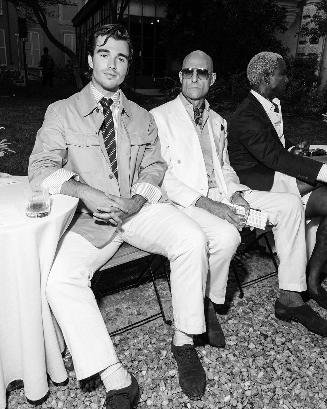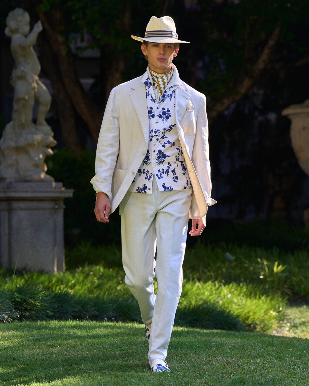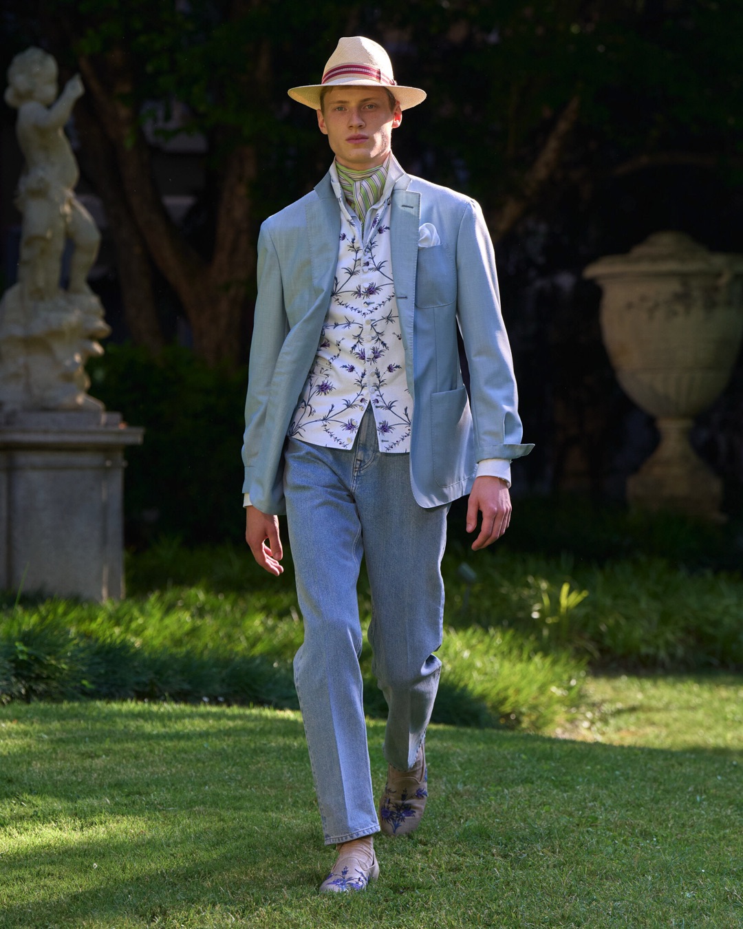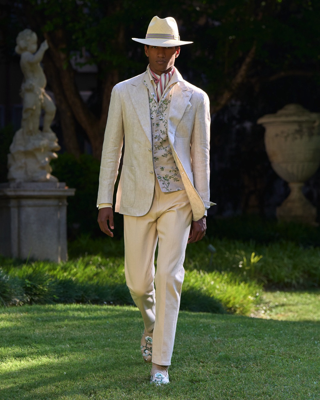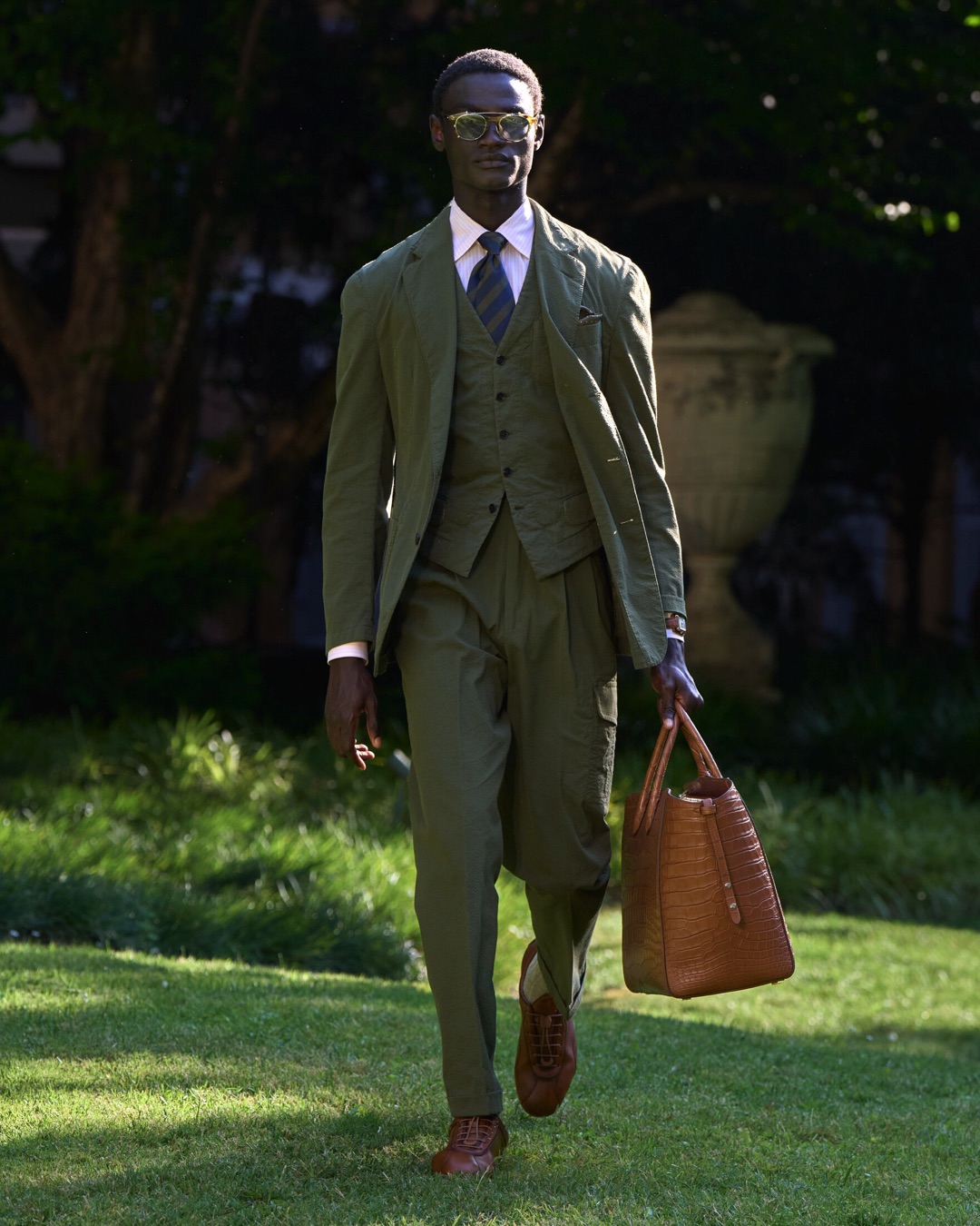 Key pieces include Glen check car coats lined in tattersall, bonded linen suits softened by sun-faded pastels, and haberdashery in irreverent gelato shades. English-milled fabrics – wool-linen blends, silk-cotton twills – are cut with precision and finished with hand-rolled seams and monogrammed cuffs. The Davies driving sneaker returns in supple suede, nodding to a rich motoring legacy.