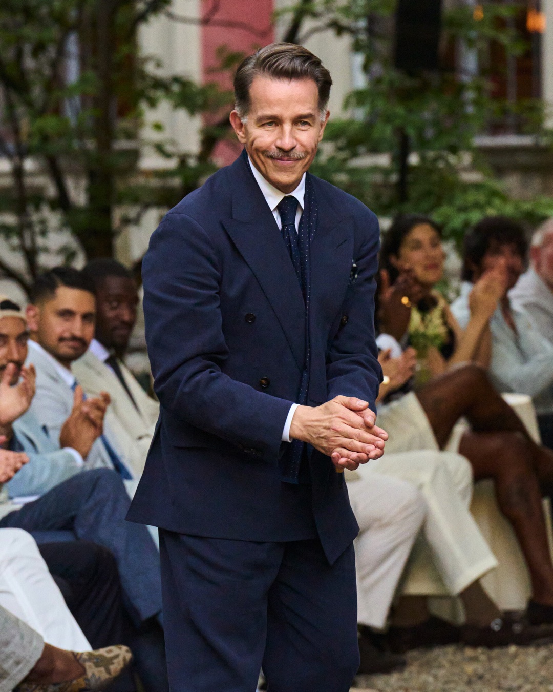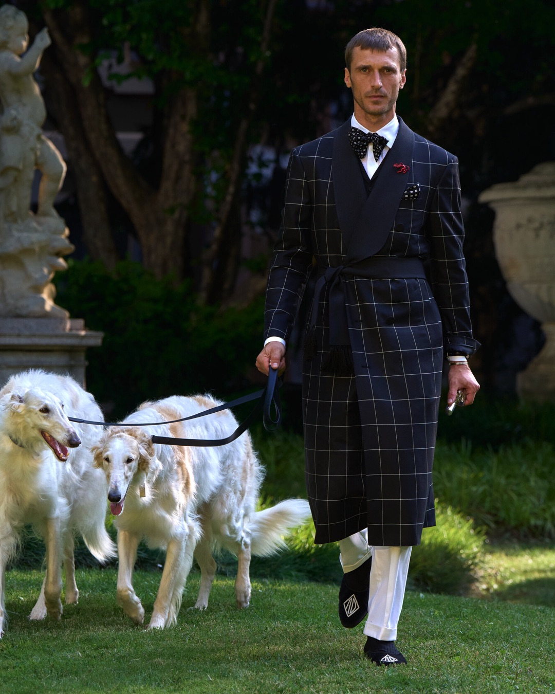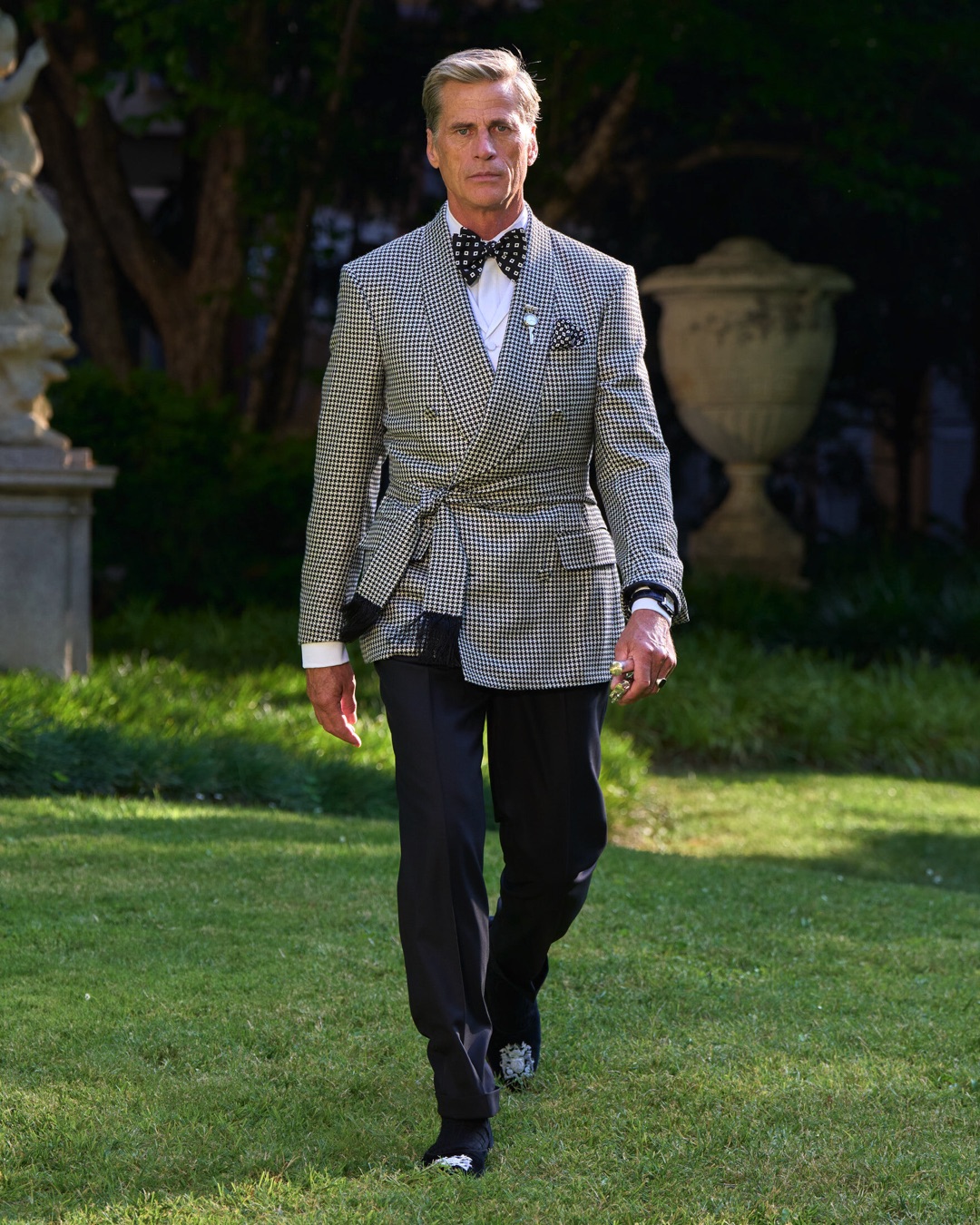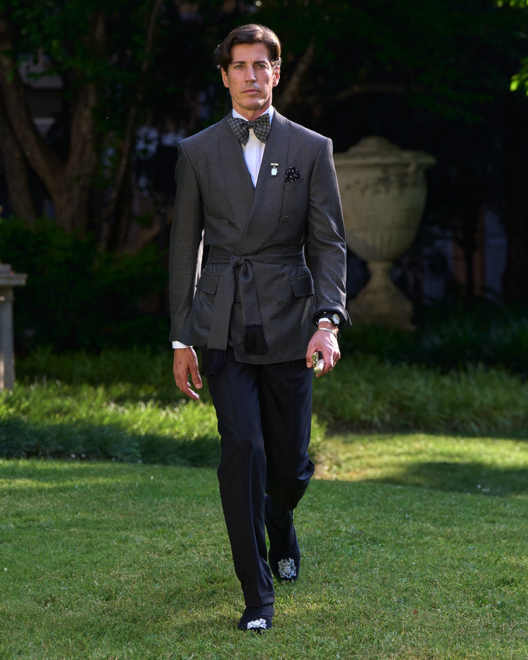 This season draws on a dual heritage: the tailored aristocracy of the Duke of Windsor and King Charles III, and the insouciant style of bohemian icons like Bryan Ferry and Charlie Watts. With silhouettes ranging from precise city tailoring to relaxed cocktailwear, the collection speaks in contrasts – ceremony and ease, discipline and decadence – and is defined by hand craftsmanship.