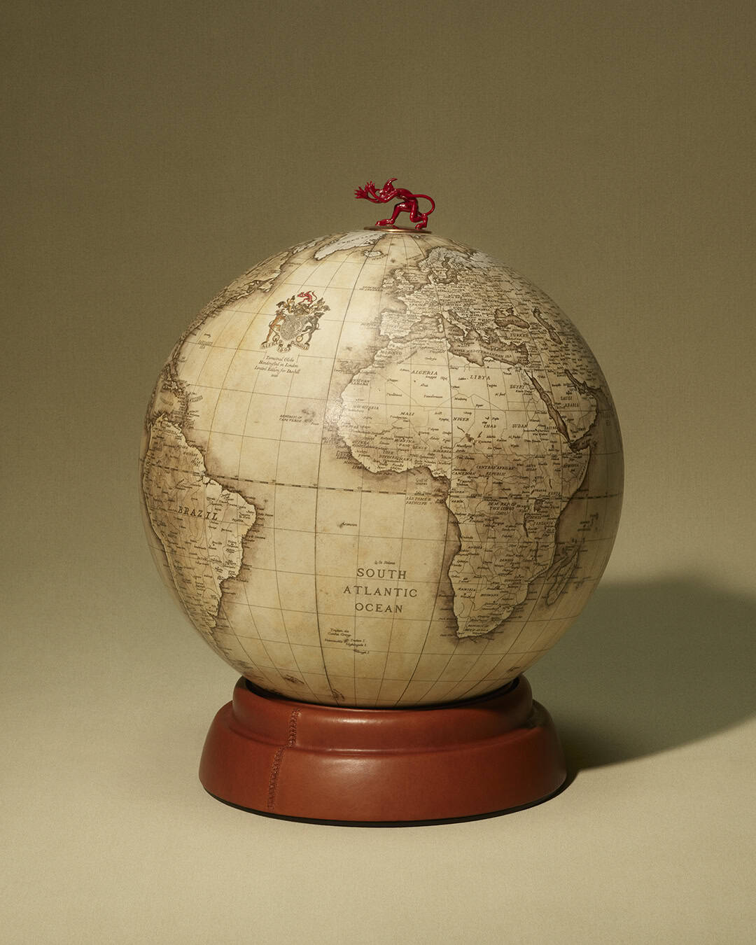 For the discerning gentleman of compass and curiosity. Crafted in collaboration with Leonardo Frigo, a London-based Italian artisan steeped in 17th-century Venetian globe-making traditions, this piece is a singular expression of dunhill savoir-faire. Its wooden frame is layered with plaster and wood, over which copper-plate printed cartography – created using a bespoke Venetian paper formula – is hand-applied. One segment bears our armorial insignia, another our mischievous Tweenie. The base is English oak, hand-wrapped in Walthamstow, London, with our signature steering wheel stitch. Above it, the Tweenie dances atop the world – a playful but pointed symbol of the House’s enduring craftsmanship. This is adventure, fashioned into a one-of-a-kind heirloom.