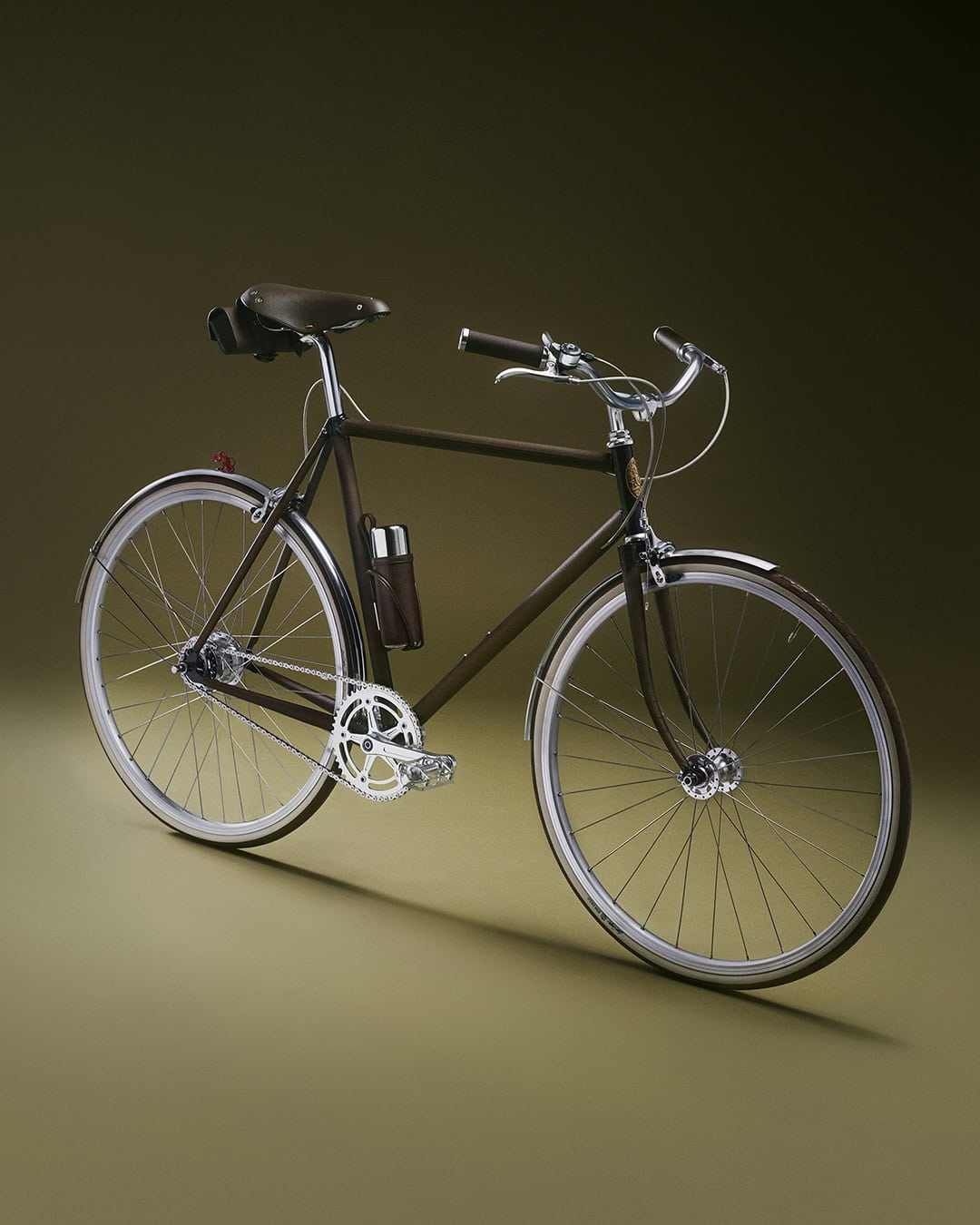 A tribute to English mobility and craftsmanship, this made-to-order bicycle is inspired by Edwardian frame geometry. It is meticulously clad in leather – every curve, corner and joint hand-covered at our workshop in Walthamstow, London. A steering wheel stitch traces the contours, echoing our motoring heritage. The saddle, modelled on a vintage original, conceals a flash of red goatskin beneath. The finishing touch: a metal Tweenie, a nod to Alfred Dunhill’s historic motorcycle mascots.