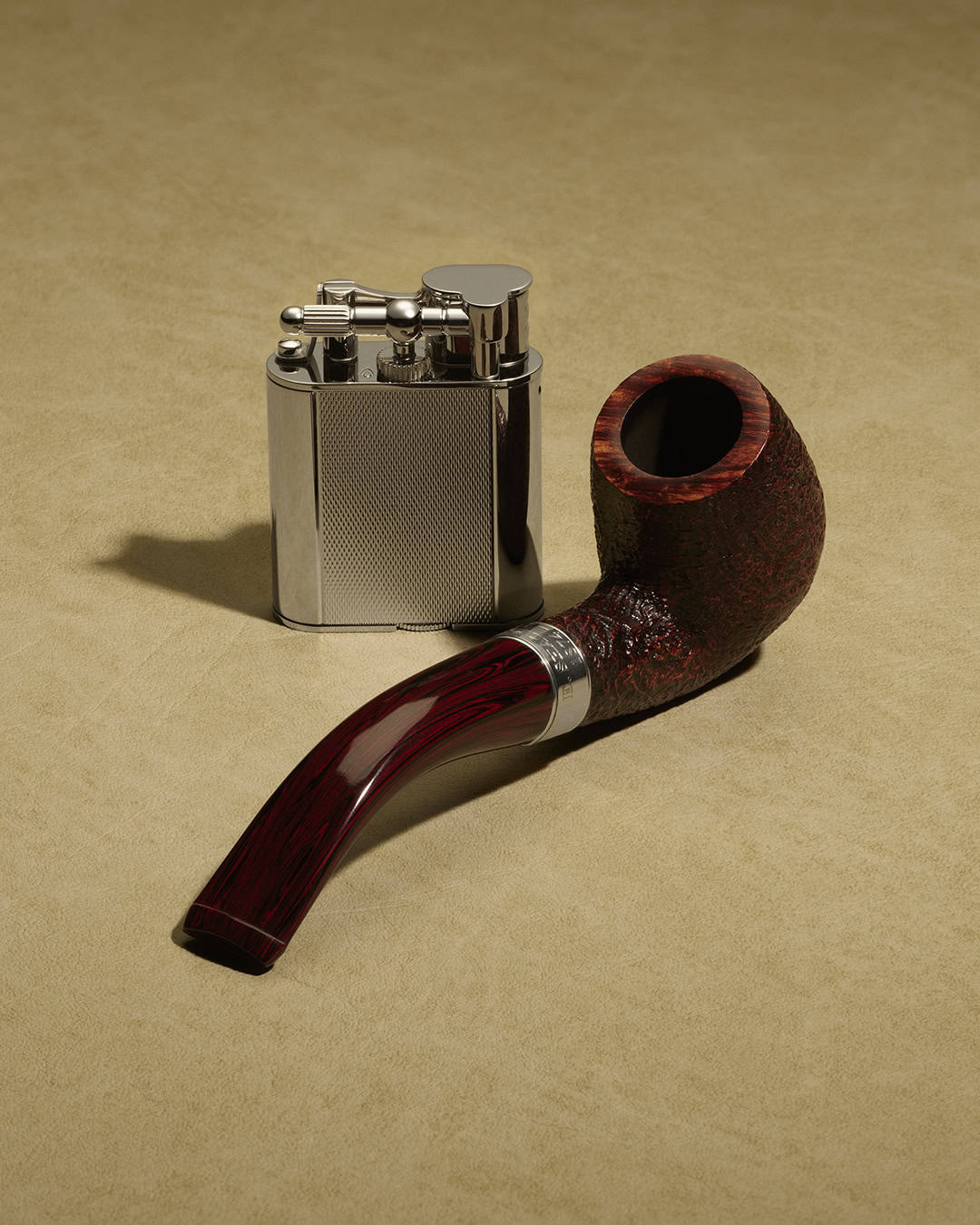 Alfred Dunhill’s 1904 patent for the windshield pipe is still admired today, as is his innovative sandblasted Shell Briar finish. This Shackleton pipe, crafted in our workshop in Walthamstow, London, has a Cumberland stem, and is one of only 49 in existence. In tandem, the Barley Turbo lighter, issued in polished palladium-plated brass, brings ceremony to pause. Together, these articles transform moments of solitude into acts of cultivated reflection.