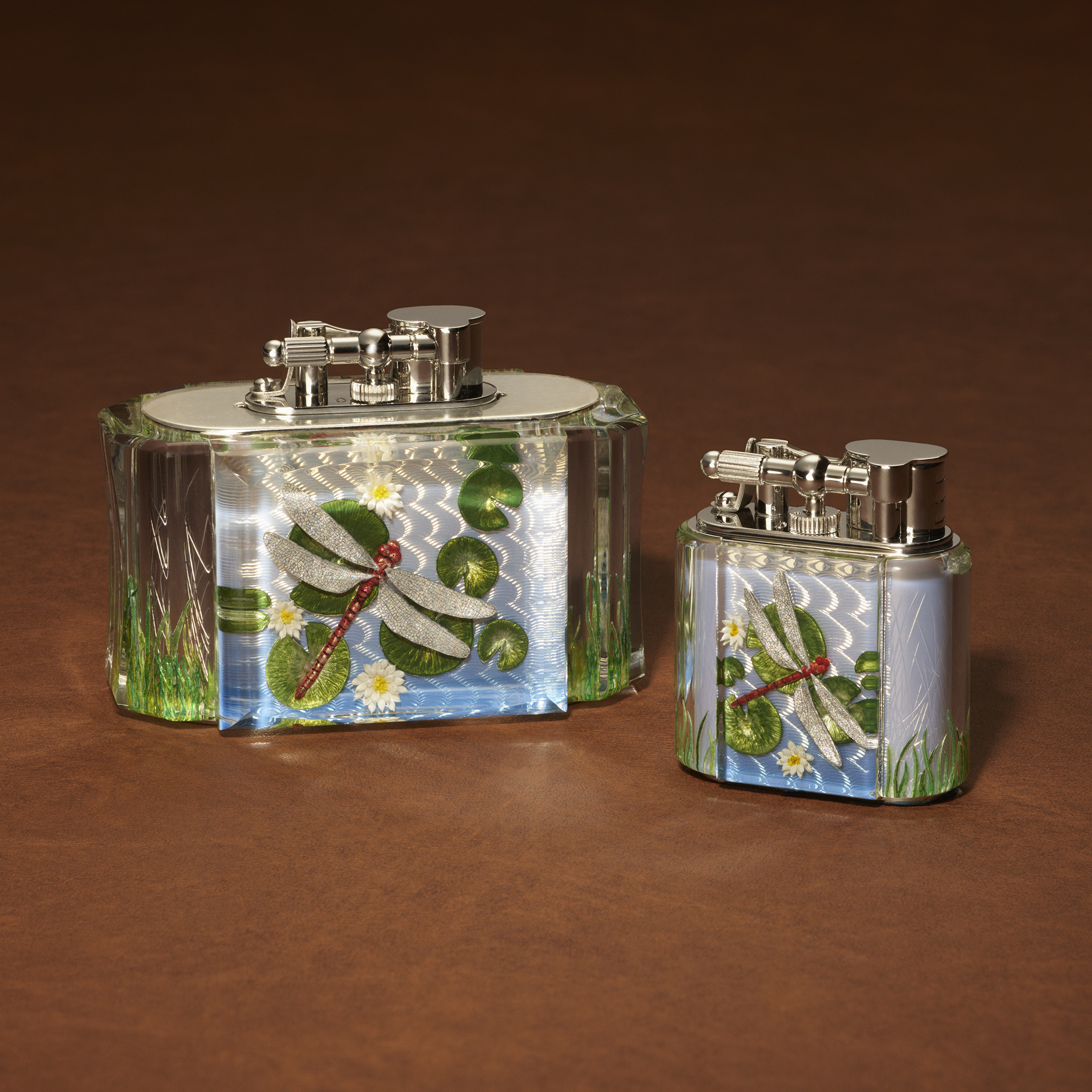 The Aquarium lighter is a functional objet d’art.This limited edition features a hand-carved dragonfly scene, brought to life in reverse-painted lucite by a London-based artisan who has long served the Royal Household. A rediscovered archival motif is cut and painted by hand, then backed in silver to evoke English dragonflies skimming across water. The palladium casing houses a refined mechanism; the result is a singular union of history, mastery, and light – a revival of craft techniques unseen for over two decades. Irreplaceable, unmistakably dunhill.