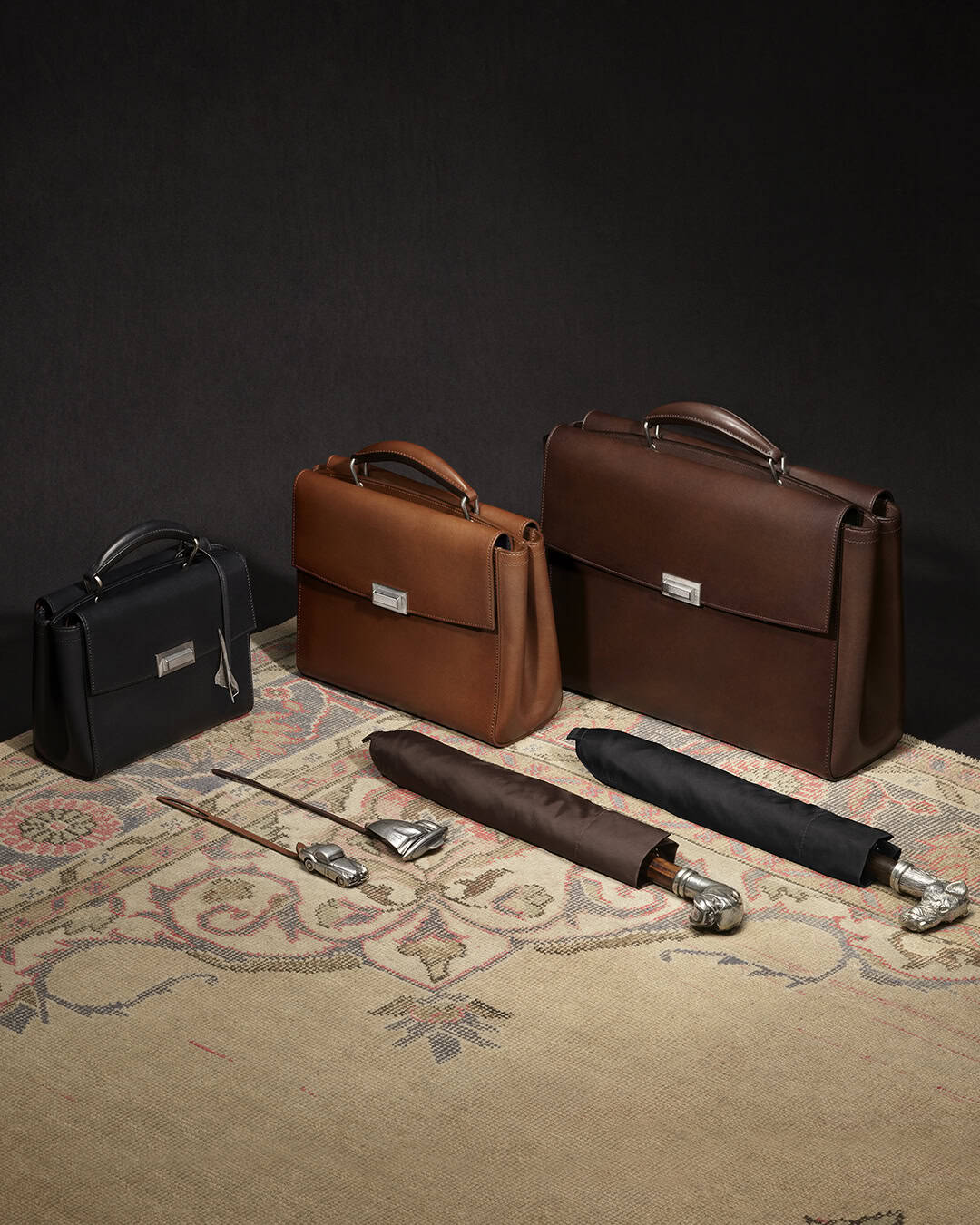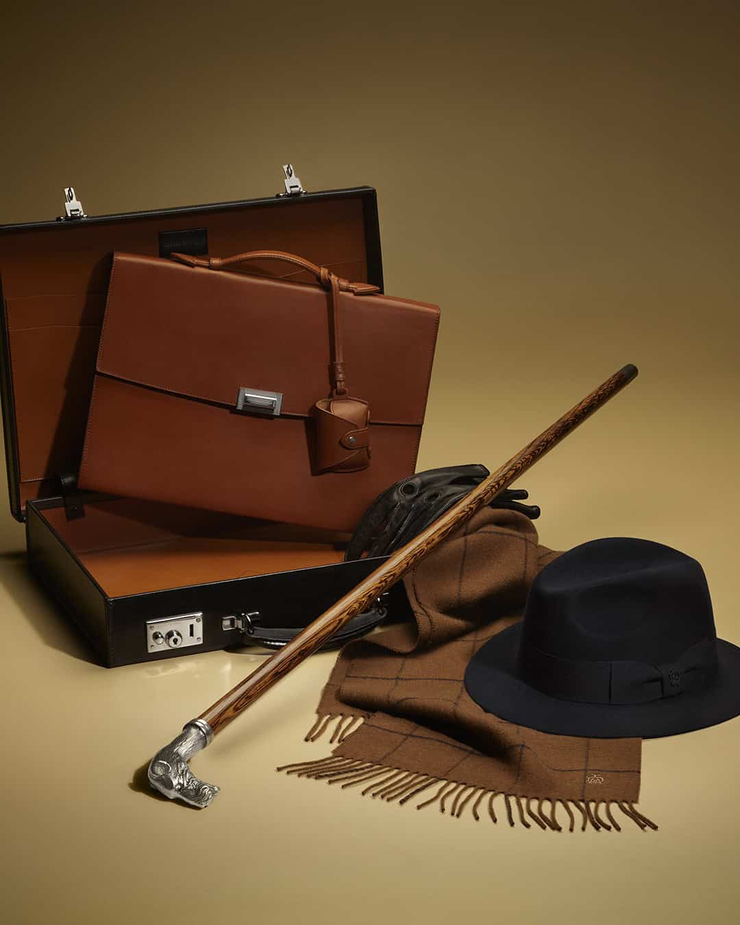 A bulldog umbrella, with handle fashioned in pewter, leads the way. A Burnished Leather Briefcase follows, braced for any appointment. A gentleman may walk alone, but his accessories never go unnoticed.