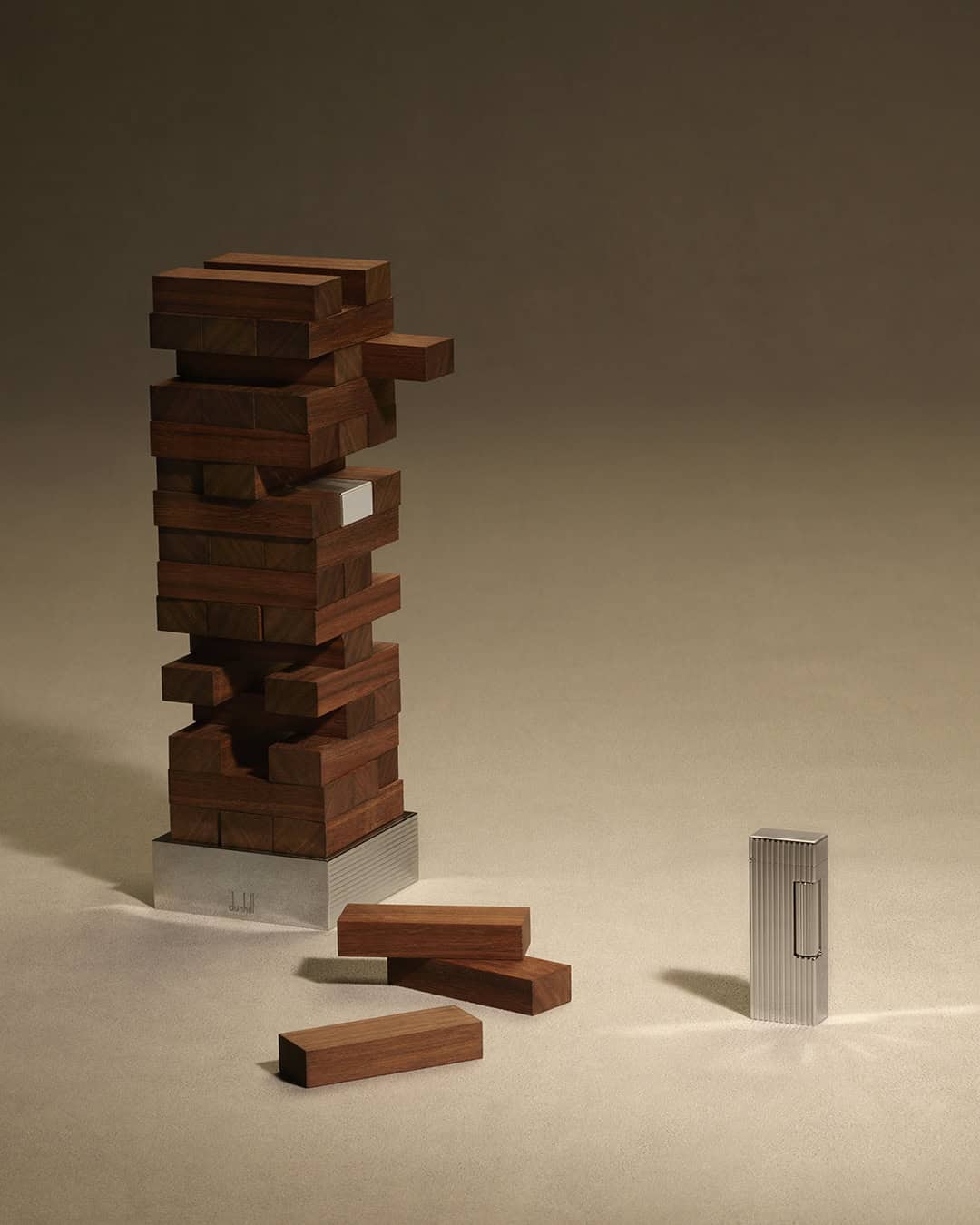 An icon within an icon. A palladium-plated hobnail Rollagas lighter, secreted in an English oak topple block game, and housed in a goatskin leather slip case. A conversation piece, a playful point in the day, a collector’s delight.
